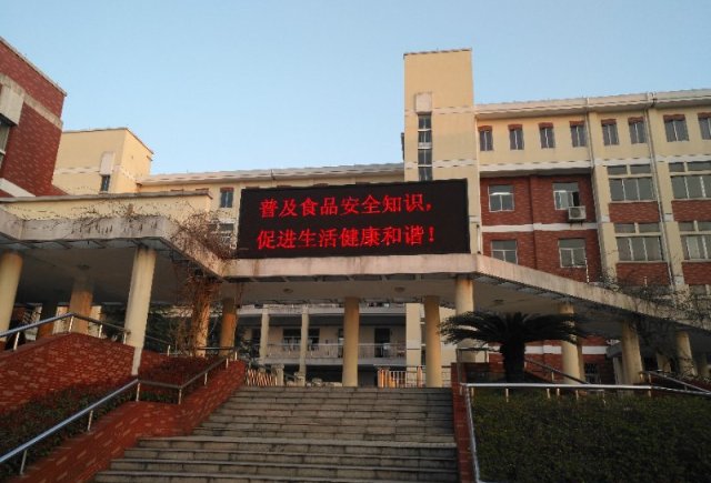 为加强师生食品安全意识,学校利用展示媒体、展示橱窗等营造宣传氛围,在校门口以及教学楼的电子显示屏等显目之处显示“食品安全严把关,呵护生命贵重泰山”、“创建省食品安全市,我关注、我参与、我受益”、“普及食品安全知识,促进生活健康和谐”等宣传标语,并设立食品安全知识普及专栏。